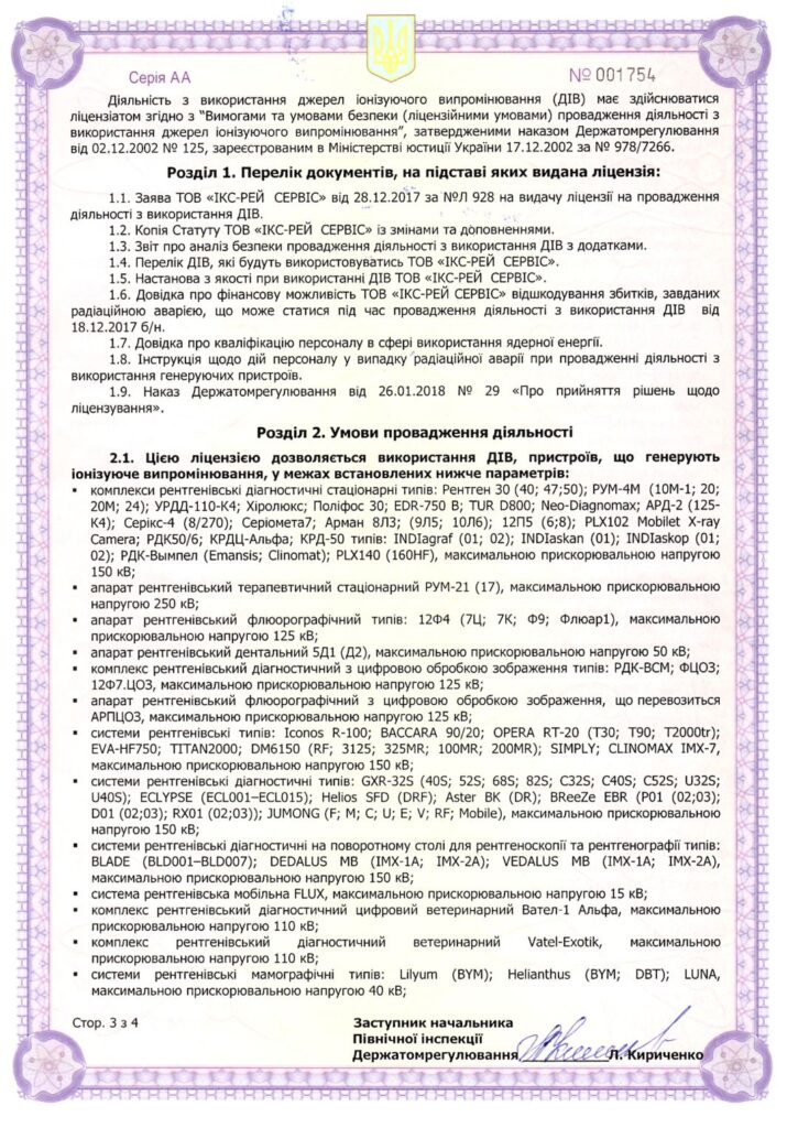 на які ТОВ «ІКС-РЕЙ СЕРВІС» має дозвільні документи та можливості здійснювати технічне обслуговування, монтаж, демонтаж, інсталяцію, налагоджування, введення в експлуатацію, ремонт, отримання (придбання) та передача (збут) ДІВ, у тому числі з метою постачання.